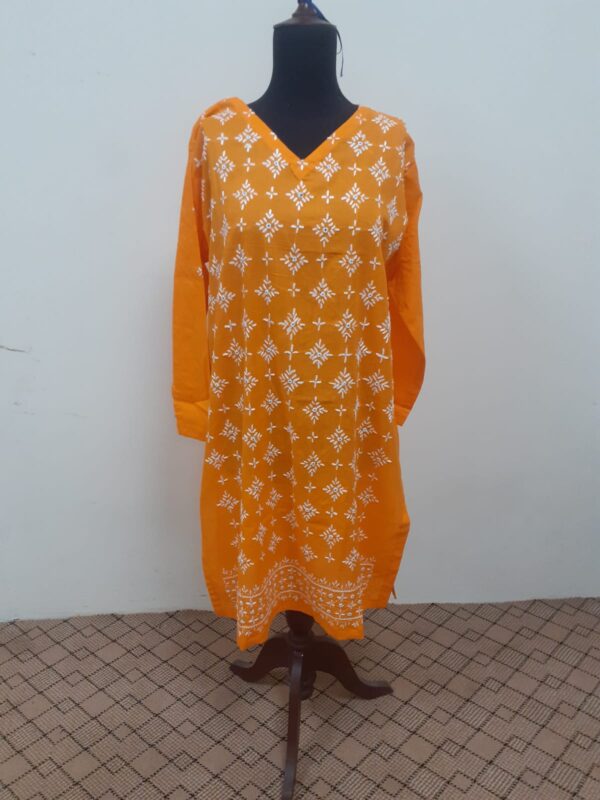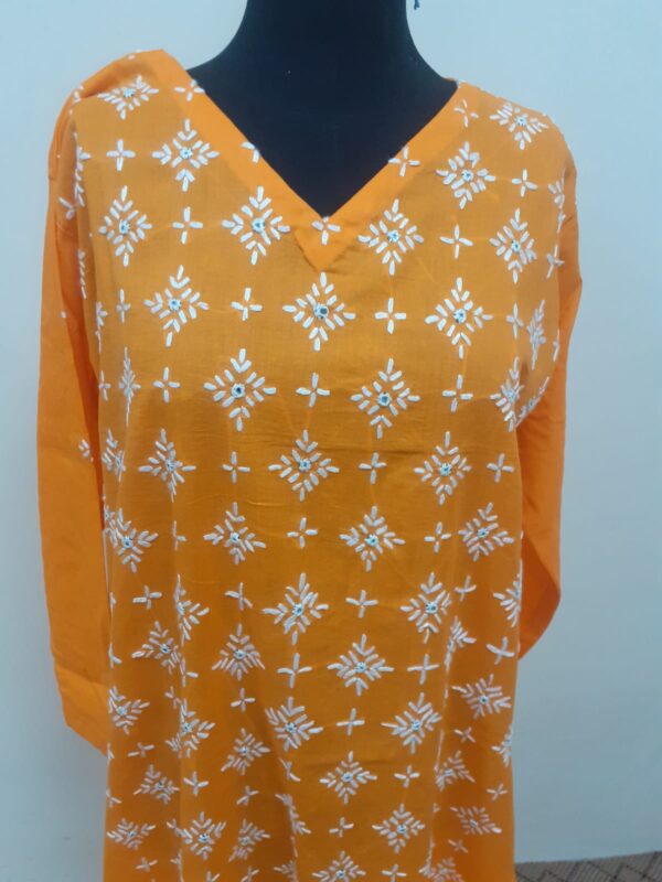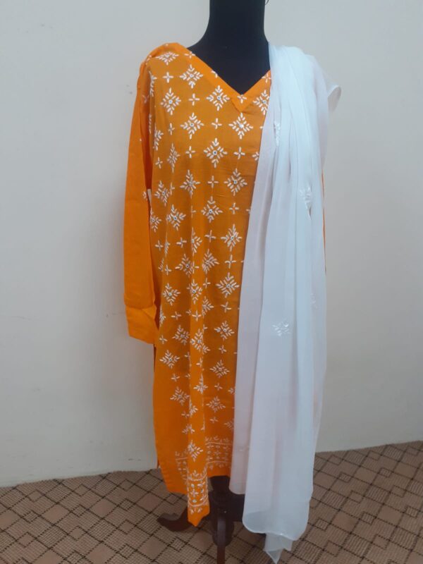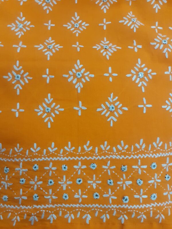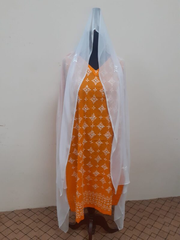 This is white & orange color combination dress.Its fabric is cotton with hand embroidery. Dopata  and Trouser is white color.