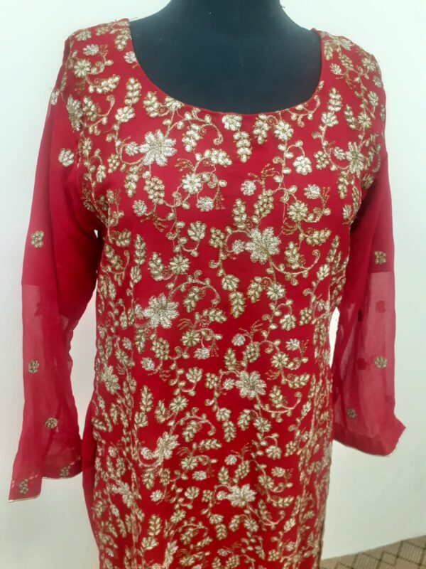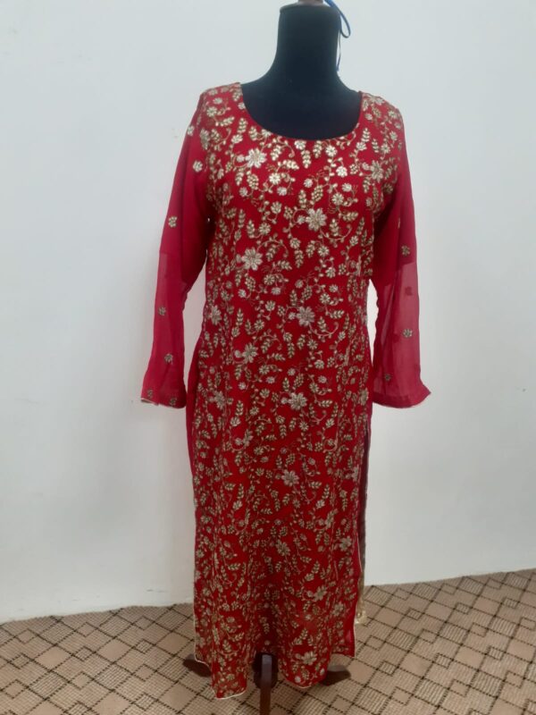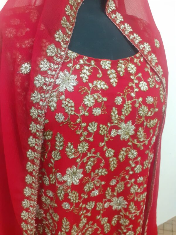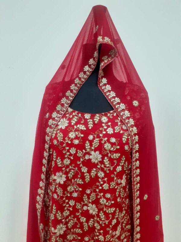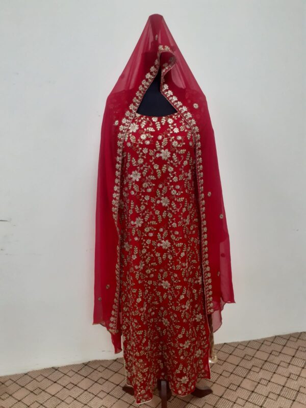 This is dark red color wedding dress.Its fabric is crinkle shiffon embellished with machine embroidery.Two long side running border on dopata.