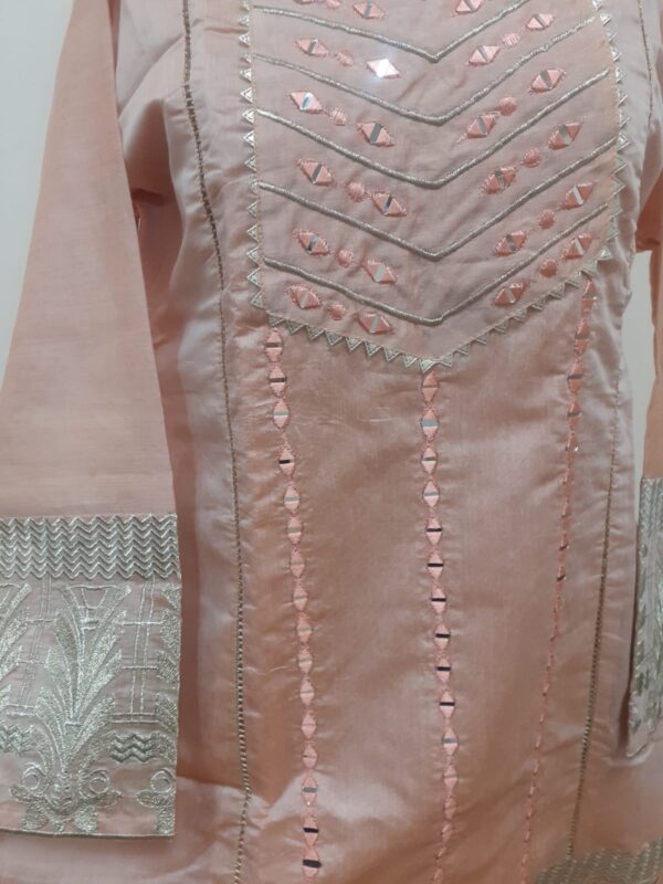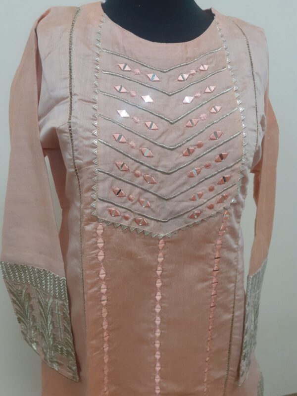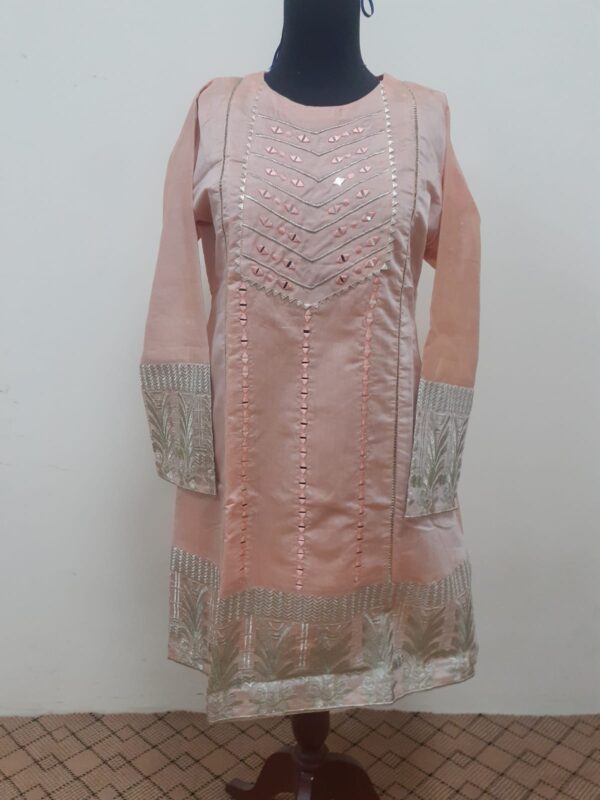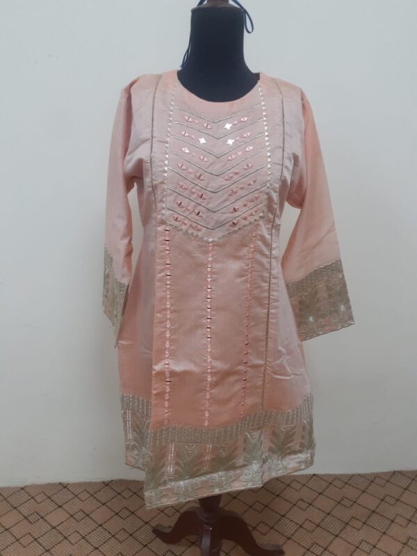 This is peach color girls shirt.Its fabric is paper cotton embroidered with mirror and thila work.